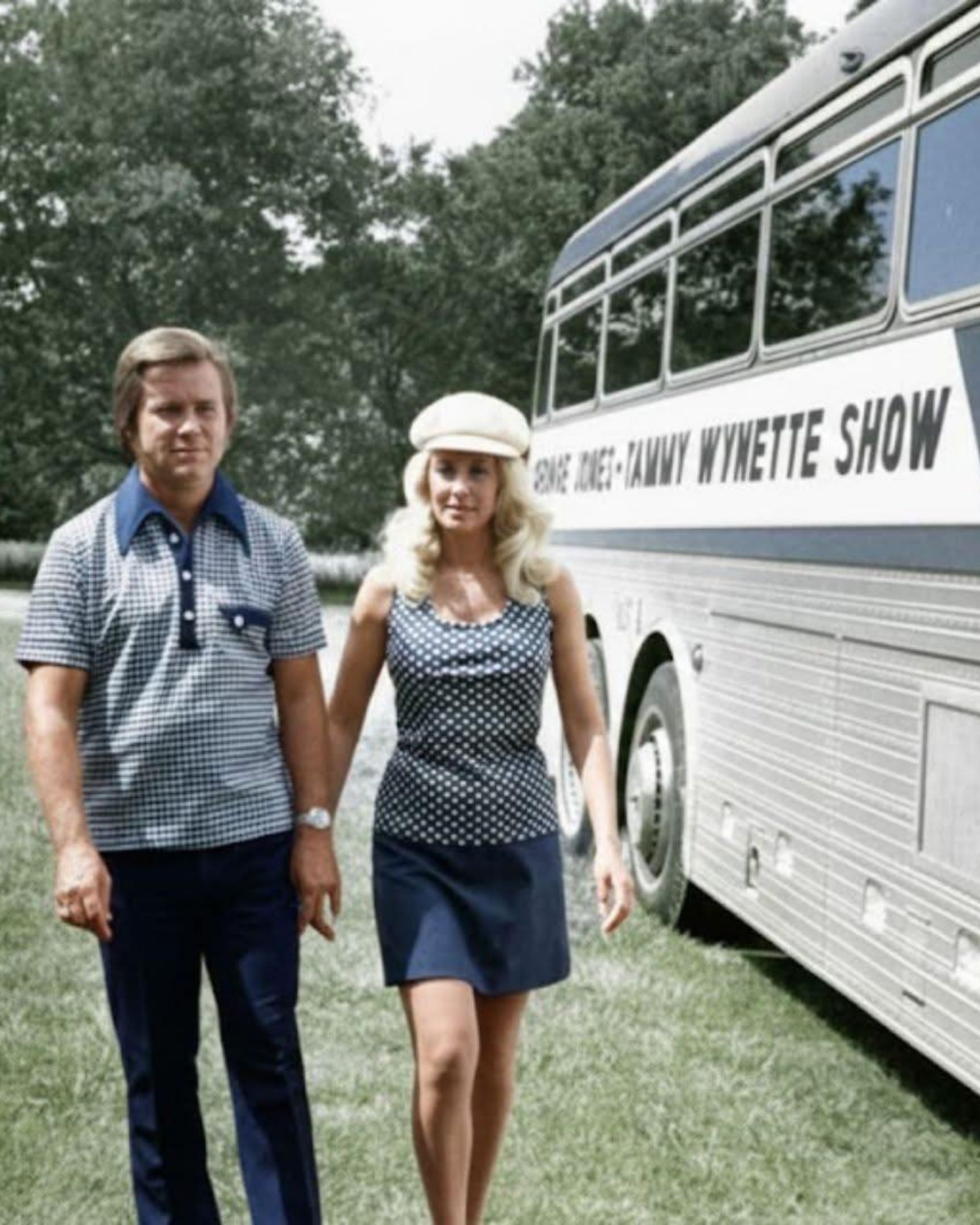 They’re not performing here. No microphones, no spotlight—just two people moving between shows, hands close, steps in sync. The bus beside them carries both names, George Jones and Tammy Wynette, as if the road itself couldn’t tell where one ended and the other began. In moments like this, the noise of the era fades. What remains is routine, distance, and the effort it took to keep going together. This image doesn’t explain what followed, and it doesn’t need to. It holds a quieter truth—how love and work shared the same narrow path, how legacy was built between venues, not just onstage. For a time, walking side by side was the job. And that, more than the headlines, is what endured.