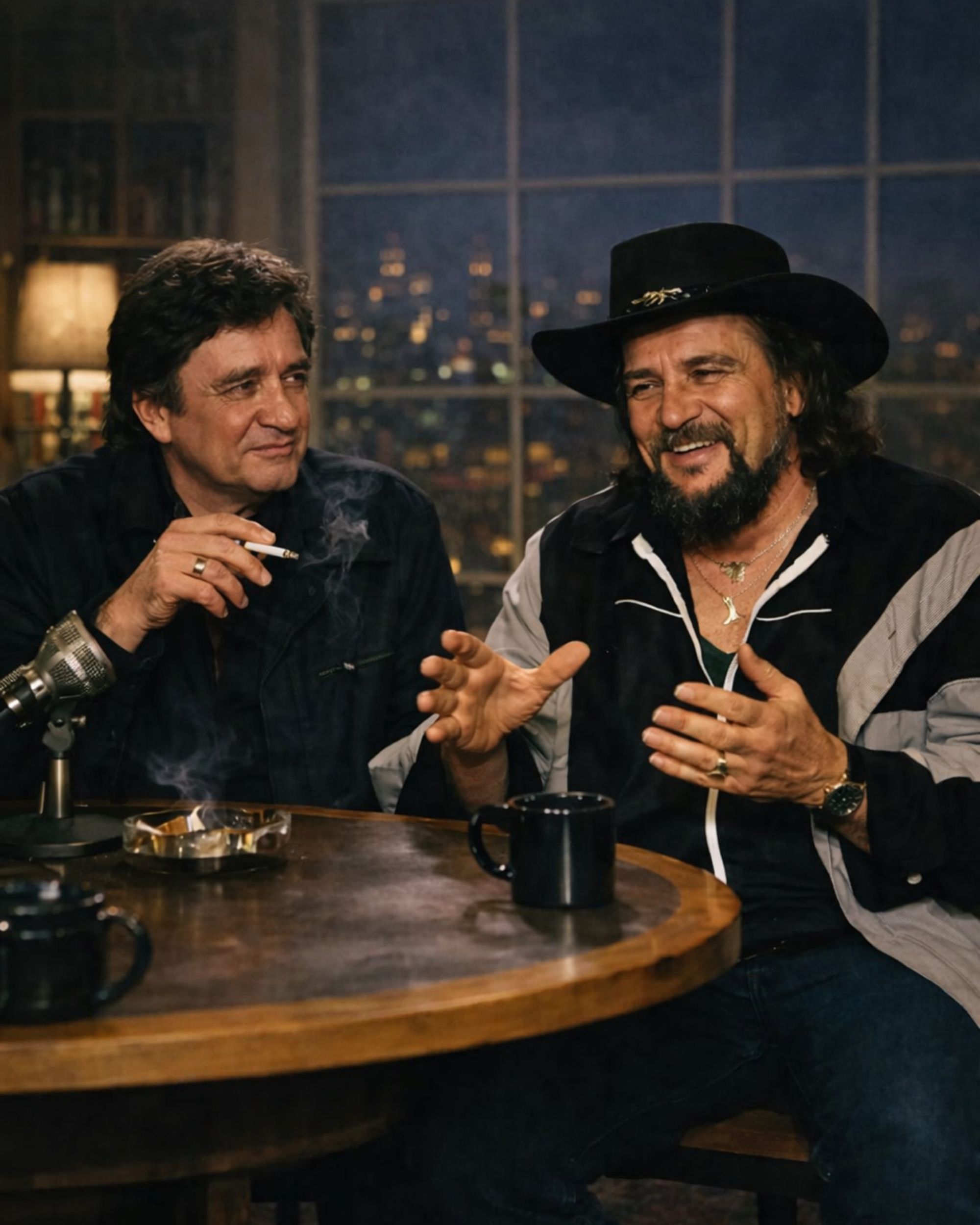 The studio lights did not feel like a stage that night, they felt more like a quiet room where two men decided to stop performing. Johnny Cash and Waylon Jennings were not there to reinforce their outlaw reputations. They spoke slower, more carefully, choosing honesty over myth. The audience leaned in, sensing that this was not entertainment, it was confession.